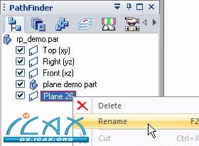 注:重合平面与所选面关联。当编辑所选面时,重合平面将保持与该面相同的方向。重命名重合平面。选择Select Tool(选择工具)。在PathFinder(路径查找器)中右击该平面并点击Rename(重命名)。 输入"Plane A"然后按回车键。 注意全局参考平面上的矩形(为了看清,零件和基本参考平面被临时隐藏)。选择一个平面用于绘制草图或轮廓时,草图或轮廓窗口与窗口左下角的矩形一同定向。在创建平面时用户可以控制该方向。如果需要,也可以后更改方向定义