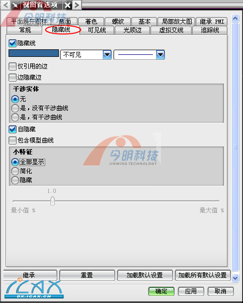 【简述】 “视图首选项”允许控制图纸上的视图显示。可以控制隐藏线、剖视图背景线、轮廓线、光顺边等的显示。 菜单:选择首选项→视图 。工具条:制图首选项→视图首选项 【操作主要菜单常用预设置选项】