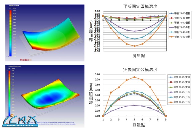 客户简介 MAERC 客户: 中原大学 产业: 学术 解决方案: Moldex3D eDesign 国别: 台湾 中原大学模具与成型科技研发中心系于2001年承接教育部顾问室『精密机电科技教育改进计划』而成立,其主要是在模具与成型领域进行跨校纪的资源整合并建立前瞻性的特色实验室作为产业人才培育与研发的基地来提升产学合作和国际接轨以促成国际实质的交流与合作。 大纲 塑料射出成型虽然可以快速且大量生产,但因制程引起的翘曲缺陷却难以轻易获得解决。此研究透过产品的肉厚设计(平板 vs. 40%突变厚度平板),以及温度参数(30°C、45°C及60°C)的变化来观察各组合对于翘曲的影响。这份研究结果可以解决收缩翘曲问题,建立肉厚减薄的设计规范供产业界应用。 挑战 随着产品设计愈趋复杂,产品肉厚对于收缩翘曲的影响性非常大,这类缺陷对于产品良率有直接影响,常常会造成产品尺寸不精确或是装配不全的问题。此外,影响翘曲的因子相当众多,例如:温度、肉厚均匀性、残留应力以及冷却时间…等,必须透过适当的控制和设计才能成功生产符合标准的产品。 案例研究 以往为解决产品翘曲,通常都是透过调整制程参数;但假如在产品设计端的设计有超过规范时,单靠制程参数要解决务问题则是相对困难。为了要有效解决及控制翘曲问题,本研究使用创新的突变肉厚设计搭配温度控制来改善翘曲问题,希望此种方法可建立起设计规范,并实际应用于产业界。 为了解产品肉厚设计以及温度对于翘曲的影响,此研究在实验和分析产品部分设计一长方平板与一单边突变厚度(40%)的平板搭配特殊设计的扇形浇口,以确保熔胶进行充填时可同时间达到相同位置。 study-of-product-warpage-with-discrete-rib-flat-structure-1 分析结果与实际产品 透过两侧不同温度参数控制可使得平板以不同形式收缩造成翘曲,翘曲方向向上为U向下为反U字型,而在翘曲观察点的部分,以长平板与浇口接触点开始分为10等分,纪录其每一点的翘曲位置。在分析的model上也设置9个与实验测试点一样位置的量测点,以帮助我们分析完成后可以快速地取得所需要的信息。 study-of-product-warpage-with-discrete-rib-flat-structure-2 翘曲测量点与U型、反U型翘曲 从Moldex3D的分析以及实验结果中可发现,在固定公模温度较高时(30-75°C, 45-75°C, 60-75°C),长平板以反U字型翘曲,而对于突变平板而言,反U字型的翘曲量更甚,其原因为突变平板在母模面的肉厚掏空造成收缩时体积较少,导致收缩时产品靠公模面的收缩较大。 而温度变异方面可看出,双边温度差越大对于产品翘曲影响越大。另一方面,在固定母模温度较高时(75-30℃, 75-45℃, 75-60℃),长平板则以U字型翘曲,而其温度条件对于变平板而言,则可以将翘曲量缩小,其原因在于肉厚单边掏空造成往公模面的收缩也减小,达到抑制翘曲目的。因此,可以将肉厚剪薄之于模具温度控制的观念应用在3C产品背盖上,达到在容许范围内有效控制翘曲量的目的。 study-of-product-warpage-with-discrete-rib-flat-structure-ch 长平板与突变平板翘曲结果 Moldex3D分析结果可以验证不同的温度设定与产品肉厚,其控制因子对于产品的一定影响;其分析与实验结果也相符合。因此,使用Moldex3D作为先期预测的仿真分析软件来预测其流动和收缩翘曲的情况,以其结果来做后续实际开模则可省去许多测试成本。 |