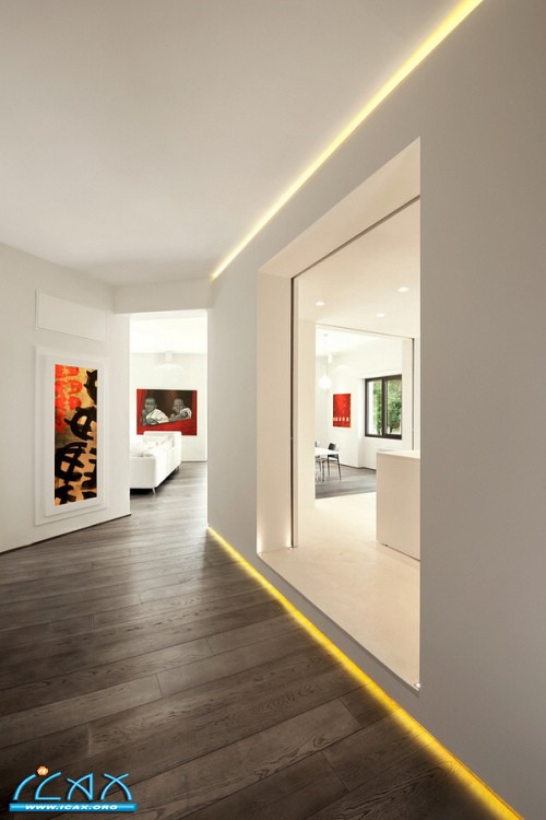 这是一所位于意大利古罗马斗兽场附近的公寓住宅,由 Carola Vannini建筑事务所近期完成设计。客户要求创造一个开放的连贯空间,且具有良好的采光照明和通风。CELOI公寓拥有一个客厅和餐厅的联通空间,一个半开放式厨房和三间不同风格的卧室及各自独立卫生间。 公寓进门的走道由长条灯带引向室内空间,端景的艺术装饰画令人忍不住立刻走近欣赏。 CELOI公寓的特点是尽量减少吊顶光源的运用,而采用暗藏灯带的间接照明,和局部射灯照明突出背景的光源。与《清新淡雅的阿姆斯特丹白色公寓》异曲同工。 这个角度是我最喜欢的,清爽简洁,印有人面图案的花瓶很精致。 客厅依旧没有使用大灯作为主光源,灰色实木地板和清爽的白色墙面,配合少许红色配饰的融合,简单也不失温馨。 厨房有一个很大的白色岛台,烹饪美食的同时也可以一边品尝和交流。 一条长长的走廊连接3个不同风格的卧室: 主卧里很有情调得摆放了一个浴缸,这款很有意思的吊灯和《简约朴实的住宅设计》中使用的一样,出自有“光之诗人”之称的德国照明设计师Ingo Maurer之手。 |