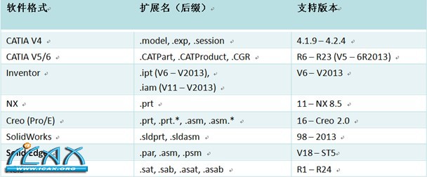 其次,看看数据输入方面,中望3D 2014在原基础上增加了SolidEdge、ACIS的数据格式,使兼容面进一步得到扩展,几乎含盖了目前国内所有的三维设计软件。以下是中望3D 2014版兼容情况: