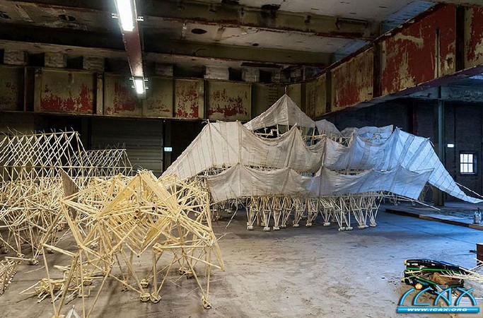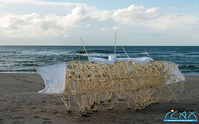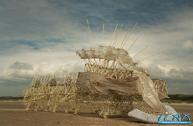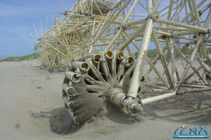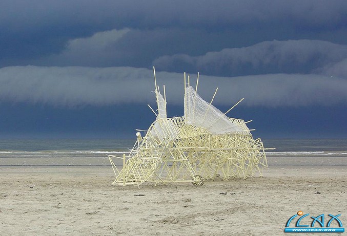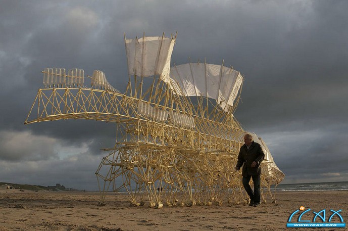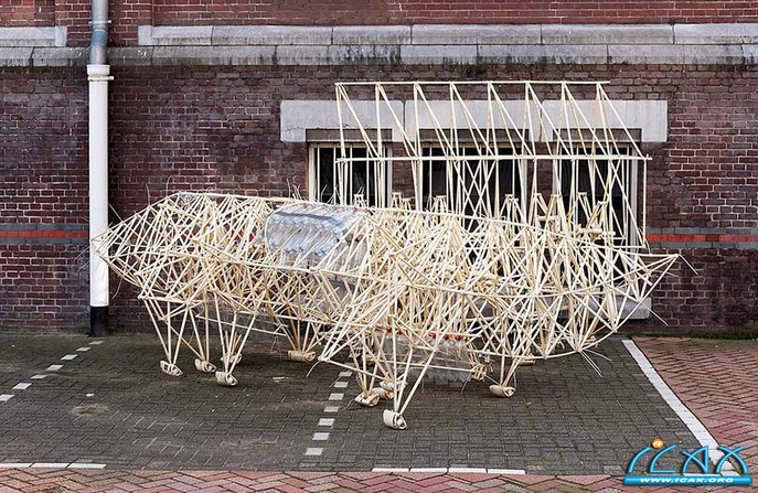 Theo Jansen是荷兰的动能艺术家,从1990年开始,他便投身到一项不可思议的项目——“创造新的生命形式”,20几年来,在他手上也诞生了许多“新生命”,它们有个名字叫:沙滩怪兽(Animari)。而让人们意想不到的是,这些能自己行走的怪兽竟然是用PVC管材制作而成,而它们体内也没有任何电力或者能源驱动装置,只要有风,你便能见到它们行走的身影。 Theo Jensen把他的小动物们称为“Animari”。它们由风驱动,性喜群居,爱在沙滩活动。不同的Animari有不同的性状,有些能够收集和存储风能,从而增加行走的次数,还有些具有自我主动防护的功能,这类海滩“生物”可以在风太大的时候把自己锚固在沙子中,以防被吹走。 Jansen并不是搞物种创造出生的,他原来研究过物理,然后又放弃了成为一名画家。1979年的时候他在家乡造过一部土产UFO,在家乡群众中引发了一阵小骚动。这位天马行空的大叔甚至还设计过一部“绘画机”。 1990年,他终于为他丰富的物理学知识和满溢的艺术灵感找到一个结合点,或者找到了一个出口,那就是创造Animari。像构成DNA链的氨基酸一样,塑料管的数量和长度的差异构成了不同的Animari的“基因代码",进而决定了不同个体的行走方式和对环境的反应。 他的设计借助风的力量,将简单的塑料管变成了可以行走的庞然大物。看似复杂的设计其实只是运用了很简单的机械结构。 Jansen目前已经着手建立理论体系,为这些海滩“生物”设想远大未来了。他认为在未来它们将通过竞争而进化,胜者虏获输者的DNA,从而完善自身。甚至有一天,它们可以进化出皮肤,乃至足够复杂的大脑,来做出更高级的生物反应。