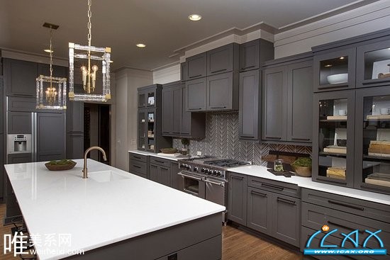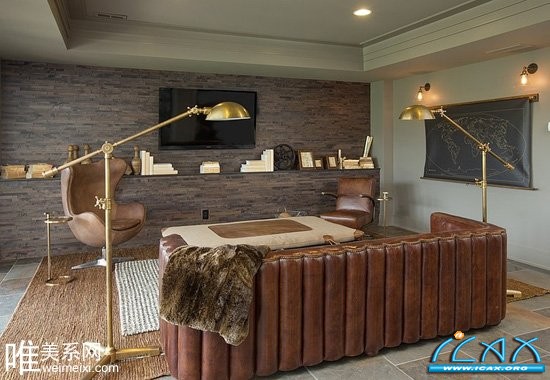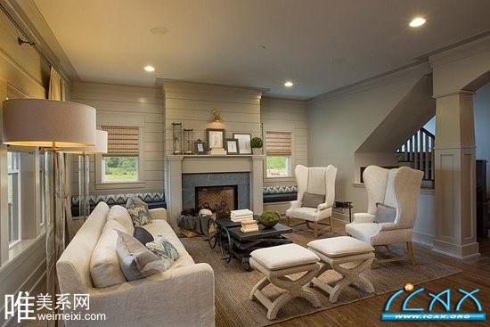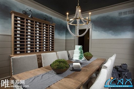 如果说人们多美国人的家居风格还是粗狂、狂野的那种西部牛仔式风格印象的话,那么你就OUT了。由于环保宣传深得人心,所以现在连一向以浪费闻名的美式家居设计都开始追求环保和自然了。为了达到这样的效果,在今天的案例中设计师们选择了以手工范木质装修来表现这两种主题。设计师在整个屋内巧妙的运用木质地板和在墙面上采用木质条纹来营造一种自然的氛围,为屋主打造了一个自然环保而又高雅别致的居所。 首先是在可鞥听,设计师利用了原本在屋子中的顶梁柱将它加以装饰成为了分割客厅与楼梯以及划分功能区的道具。整个客厅是明显的乳白色色调,配以一面大理石瓷砖铺设的墙面以及壁炉,营造了一种高雅的氛围。同时设计师还在壁炉两侧窗户下面设计了软榻作为休息区,不仅减少了空间留白还十分贴心,这个设计值得一赞。 而在休闲区,最醒目的就是设计师在天花板上构造的复式吊顶。在密布的灯光衬托下,从视觉上提升了客厅的层次感和深度。摆在休闲区地摊上的几盏金色的落地灯让人感受一股高雅的贵气。而电视机背景墙也很有新意,设计师将电视机的搁板融入墙壁,下面成为一个收纳展示空间,在视觉上让物品呈现悬浮状态,空间质感提升。 而在餐厅内,那个整齐、规律的格子酒架和满满一架子的酒不仅提高了空间的收纳能力,作为一种展示,如此之多的红酒也彰显了其生活品味。背景墙上的水墨状画不仅装饰美化了空间,而且那种柔和的感觉搭配那吊灯,一股浪漫的味道扑面而来。 灰色的整体橱柜和吊柜设计打造了整齐、现代化、有着强大收纳能力和对称美感的厨房。在厨房的旁边就是一个吧台,白色大理石的吧台面与灰色木质感橱柜相得益彰,互为补充,鲜明的白色弱化了灰色带来的沉重质感,同时和亮闪闪的吊灯搭配的很好。 床头墙上的小窗户保证了窗户不多的卧室里的采光,而且为了防止早上起床被耀眼的阳光刺痛感,设计师在上面镀了一层膜。床四角竖立着的立体床架和以及和客厅一样的复式吊顶设计提升了卧室的立体感和视觉高度,简约、干净但不失优雅大气。 灰色木质装修的背景墙和储物柜让卫浴空间更显厚重质感,并与木质地板和谐过渡。墙壁的线条让整体空间更具线条感和层次感。