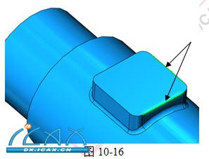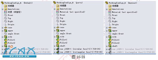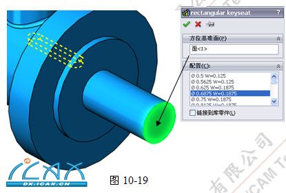 步骤9 选择参考 将特征sae j1926¬-1(rectangular face)拖放到如图10-16所示的平面上。这个特征需要选择模型的两个直线边作为参考。 选择配置716-20。选择图10-16所示的两条边作为特征放置的两个参考。 步骤10 设置尺寸数值 单击单元格,将每个定位尺寸(Locating Dimension)设置为0.5in,如图10-17所示。单击【确定】 步骤11 检查配置 在激活的配置(ports)当中,新的特征被解除压缩,但是在其他配置里还是压缩的,如图10-18所示。 步骤12 激活配置 激活配置Keyseat 步骤13 放置库特征 在设计库中打开Keyways文件夹。拖入特征rectangular keyseat到轴的圆形面上。选择配置“Φ0.6875 W=0.1875”,选择平端面作为【放置面】,如图10-19所示。 步骤14 选择参考 选择端面的圆边作为参考,如图10-20所示 步骤15 定位尺寸 如图10-21所示设置【定位尺寸】值 单击【确定】 步骤16 检查配置 在激活的配置(keyseat)中的新特征是解除压缩的,但在其它配置当中是压缩的。 |