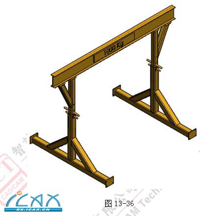 步骤19 生成模型变量 在选取参数并生成表单和规则后,您可运行 DriveWorksXpress 生成模型变量。 1. 从运行选项卡 选取或键入: • A001 作为项目号 • 500 Kg 作为安全工作载荷 • 1650 作为打开高度 • 1700 作为打开宽度,如图13-35所示。 500 Kg 安全工作载荷模型变量出现在 SOLIDWORKS 中,内部对角特征被压缩。新装配体、零件、及工程图文加在 DriveWorksXpressTutorial 文件夹中生成: • Mobile Gantry A001.sldasm • Mobile Gantry A001.slddrw • Leg A001 1650 High.sldprt • Universal Beam A001 1700 Wide - 500 Kg Safe Working Load.sldprt |