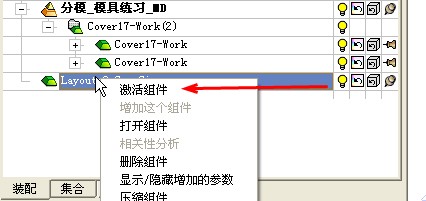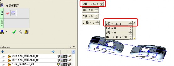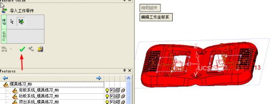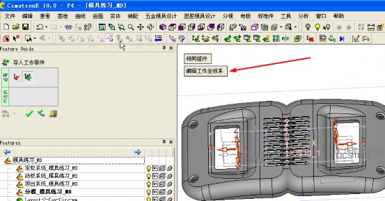 第四章 模具设计综合练习 导言 本练习是一个一模两腔综合模具设计练习,包括分模、工程变更、凸、凹模的生成、镶件和斜顶的设计、水道设计、冷却水道设计、浇道设计、工程图和开模动画等等,此 练习涉及到 Cimatrom 模具设计大部分的功能,通过练习,可以提高读者使用 Cimatrom 的水平;此练习是一个高级练习,建议把前面的基础练习做完再进入本章节的练习。 一、加载工作零件 选择一模两腔零件布局,并把零件调整到合适的位置。 1、 打开 CimatronE10,选择箭头所示的模具设计向导命令,零件布局选择 Layout-2-Cav-Circ -mm.elt,并设置参数如下图所示,然后单击确定按钮。 2、 在下面的界面里,选择箭头所示“读取工作零件”命令。 在弹出的菜单里选择箭头所指命令: 3、 在下面的窗口里先选择箭头所示命令,找到主零件:cover17,设置参数如下后,单 击确认按钮。 4、 在下面的界面里,点选箭头所示的两个坐标系来放置主零件。 因为零件位置不合适,需要旋转。在下面的界面里单击箭头所指“编辑工作坐标系” 命令: 出现如下提示窗口,请选择“是”。 点击旋转命令:并在下图右侧箭头处输入 180 度后单击确认键,使得零件旋转到合 适位置。 再次单击下图的确认键,旋转结果如下: 隐藏基准面,通过观察发现零件底面没有在布局零件上,测量 Z 向距离为 15.15,而 且零件之间距离也需要调整。 5、进一步调整零件位置,在布局零件上点击右键,选择激活组件。然后同时按下中键 和右键,把基准全部隐藏。 编辑布局零件草图特征(在草图上双击)。 把直径 175 改成 251,然后单击更新,连续点击中键两次,结果如下: 在布局零件第二个特征右键,选择编辑特征。 在下图输入 18.15(目的是让零件的底面离开布局零件确定的平面 3mm),然后确定: 结果如下图:注意零件底面高出布局零件 3mm,保存文档。 |
