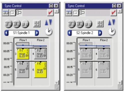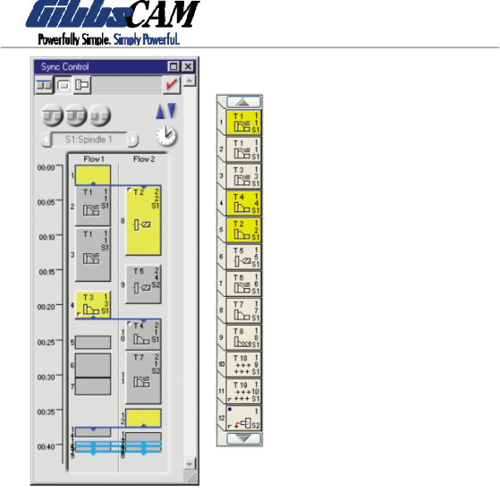 第八章:多任务车铣复合加工操作 在 GibbaCAM 的产品线的另外一个模块,用产生程序创建操作或刀具路径。在车削模 块中的车削操作与 MTM 模块中的操作没有区别,但是零件在-X 侧或在另一主轴上的除外。 并且 MTM 操作可能与其它操作同步。标准的车削零件只有一个刀具通道需要考虑。你在操 作列表上看到的操作顺序就是它们使用的顺序。这基本上与 MTM 一样但 MTM 有更多的通 道需要考虑并且操作的时间也非常重要。本章要点是讨论同步操作和设置一个 MTM 零件的 操作定时。 Operations List 操作列表 在多任务车铣复合加工(MTM)中操作块与 GibbsCAM 产品基本模块有很大的不同。 为了显示操作使用的通道号(通常情况下与刀塔号相同),刀具号,刀塔位置和主轴, 所有的都会同步显示在操作块上。 1、 在操作时同步 2、 在操作结束时同步 3、 主要公用操作 4、 附属公用操作 同步用一个小矩形显示在操作块的左上角或左下角,并且着色。 无颜色矩形 无颜色矩形是操作同步,一致同步或公用数据。无颜色的同步在左上角则是在操作开始 时同步,当在左下角时则是在操作结束时同步。 公用操作 公用操作可能在两个角都有同步。这是因为多数同步程序创建了两个同步,一个在操作 的开始,一个在操作的结束。这是系统同步。系统同步顶部的矩形为蓝色或绿色。蓝色矩形 为主操作,绿色矩形为附属操作。 公用程序通常创建多个操作,表示程序是跨通道的,每个通道中都有这个操作存在。无 论程序在超过一个通道中创建操作,其中一个会标记为主要操作。主要操作包含了所有附属 操作如速度和余隙信息。 操作排序 MTM 操作排序功能能按通道进行排列且在操作列表中用一个空格来分隔。通道内的操 作也同时会根据他们在通道内的顺序进行排序。 操作同步器 多任务车铣复合加工(MTM)允许您通过设定在操作开始和结束的系统规定参数来管 理在多刀塔和多主轴上操作的实时顺序。这包括了在不同的刀塔下的任意操作间创建、修改 和取消同步参数功能。这通过同步控制对话框来完成。所有在同步控制对话框中设定的信息 将通过零件切削渲染、后处理和可选的机床模拟中使用,显示和排序以提供给用户正确的实 时信息。 同步控制对话框 当我们同步和管理操作,同步控制对话框将是我们的助手。这个简单的对话框非常强大。 它依照操作顺序的实际时间显示了操作块。同步对话框允许您增加操作和操作的实时同步, 编辑同步,重新计算切削时间以使一主轴与其它主轴匹配,且在操作被替换时能轻易的修改。 选择在同步控制对话框中选择一个操作同时也就选中了操作列表中适当的块,操作管理,适 当地更新屏幕上的刀路轨迹。另外,当选择的操作改变时操作数据和公用工具标记对话框同 时被更新而不管他是如何改变的。对话框列出了所有的有效通道和通道内的操作。操作能在 当前所在的模式下独立选择和修改。对话同时也显示了当前的实际时间。实际时间将在您作 出修改后自动更新。 1、 同 步模式 2、 操 作模式 3、 主 轴模式 4、 检 查器 5、 统 一块 6、 缩 放时间 7、 重 新计算 同步控制对话框基本元素 其中有些 MTM 机床有个更加复杂的方面那就是他们能同时做多件事。这些机床能在同 一时间真正地远行多个 G 代码程序。此同步对话框为您用图形显示出来了。一个通道通常 是一个刀塔,确切地说是一个转台的程序。长度即代表实际时间。操作块之间的空隙是内部 操作运动的时间。 操作开始于刀具越过其在余隙位置的切削起始点。结束于其越过在余隙位置的结束点。 余隙位置可能指定或通过文档控制对话框中的自动余隙选项自动计算,这和标准的车模块一 样。内部操作运行将包括刀具移动到换刀位置,换刀块与所有的快速进给运动一样。 统一块视图. 统一块视图按钮能在实时比例和相同尺寸间进行切换。在您的操作看起来非常小或 快的时候此视图将非常有用。 模式 在同步控制对话框顶部有三个按钮,分别是同步模式,操作模式和主轴模式。这些模式 能切换对话框的三种状态。当模式改变时对话框的内容不会发生变化但显示和功能会变。每 一种模式显示不同的块选项和功能。同步模式允许您创建和删除同步,促使操作在其它操作 后等待。操作模式提供您操作列表实时的显示来编程程序或重排。主轴模式让您选择哪一个 操作控制主轴。每一个模式在下面都有详细的解释。 同步模式 “同步”是一个告诉一个通道等待另一通道的 G 代码程序命令。常规情况下,所有的 通道会一起同步会等待最后一个通道。例如,一个双刀塔机床有两个转台/刀塔且各有一个 通道。如果我们同步两个操作,第一个操作到达 G 代码同步指令会等待另一刀塔到达其 G 代码通道中的对应同步点。这些会在同步对话框中用图形显示出来。 块选择 在同步模式下可以选择操作块的顶部和底部。您只能在一个通道中选择一个。同一通道 中多选是被禁止的。选择操作块上半部分表示是操作的起始。选择操作块的下半部分表示是 操作的结束。 在同步模式下的同步控制对话框是用来增加和编程操作同步和一致同步。同步用同步控 制来设定。同步控制由三个按钮组成,一个是增加操作同步,一个是增加一致同步,还有一 个是清除同步。 1、 增加操 作同步 2、 增加一 致