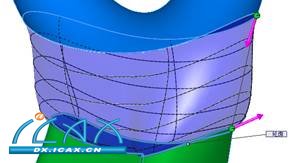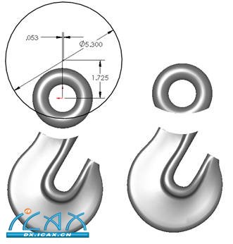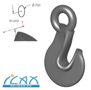 步骤15 评估放样预览 在单击【确定】创建放样特征前,查看网格的线条。在放样预览中网格的线条是黑色的细线。本例中网格看上去比较清晰,没有扭曲交错在一起。而在一些放样中,网格的线条可能弯曲、交错或扭曲,这通常暗示着放样中存在的问题,或者创建后续的一些特征(例如:抽壳、等距、圆角)将出现问题。 步骤16 创建顶部的环 在上视基准面绘制如图3-59所示的草图。直径为0.75in的圆的底部正好接触局部草图的圆。 以中心线为旋转轴旋转草图。 图3-59 步骤17 剪裁放样特征 在创建上部的环之前,很难决定放样特征的上部要达到什么位置,这就是为什么创建长度超出放样的原因。现在知道了外形轮廓之间的关系,就能够剪裁放样的特征到适当的长度。 因为放样要过度到环的圆形轮廓,所以在放样的未端更适合生成曲面。 在右视基准面上绘制一个圆心与环的圆心重合,直径为3.7in的圆,如图3-60所示。 使用【完全贯穿】终止条件, 在两个方向上拉伸切除。在【特征范围】选项组中,选择【所选实体】选项,仅将放样实体作为【受影响的实体】。 图3-60 步骤18 剪裁是部的环 为了将钩的放样实体过渡到环,需要在环上创建过渡的放样轮廓。在右视基准面上绘制一个圆,尺寸标注如图3-61所示。 使用【完全贯穿】终止条件,在两个方向上拉伸切除。在【特征范围】选项组中,选择【所选实体】选项,仅将旋转实体作为【受影响的实体】。确认使用【反侧切除】选项。 图3-61 步骤19 创建过渡的放样 现在已经在钩和环的放样实体上创建了切除表面,接下来选择这两个面创建放样特征。选择这两个面时,注意要在近似相同的位置选择。也可以选择这两个面的边线代替选择这两个面,但一般而言,创建放样特征时,最好选择面。这是因为SOLIDWORKS软件使用边线创建一个新的面时,可能会产生错误。将开始约束和结束约束设为【与面相切】,如图3-62所示。 如果放样向外凸出,可能是相切的面选择错误。在这种情况下,单击【下一个面】选择正确的相切的面。 同时也要注意接头,它取决于用户的选择。由于可能需要移动它们,因此,最好将它们置于如图3-63所示的位置,即零件的对称面(右视基准面)。 图3-62 图3-63 步骤20 绘制一个点 创建一个相对于钩放样较小的终止面【等距距离】为0.5in的基准面。 在新建的基准面上绘制如图3-64所示的一个点。在该点和原点之间添加【竖直】几何关系或者与右视基准面之间添加【重合】几何关系。退出草图 图3-64 步骤21 放样尖端 从钩放样的终止平面到新绘制的点之间创建放样特征。在本例中,放样到一个点是很有效的方法。 如图3-65所示,在【起始/结束约束】选项组中的设置如下:【开始约束】设为【与面相切】;【结束约束】设为【垂直与轮廓】,【结束处相切长度】设为2.2,使尖端处看上去宽一些。单击【确定】。 图3-65 步骤22 显示结果 完成的吊钩如图3-66所示。 图3-66 步骤23 保存并关闭零件 [本章结束] |