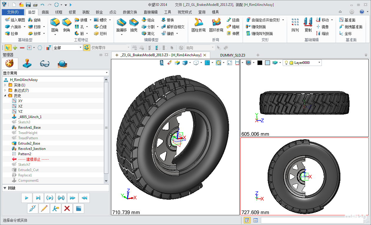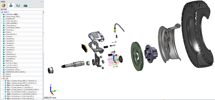 其中在画轮胎花纹的时候,主要使用了中望3D的阵列和替换面的功能,简单几步就在旋转主体上面做好了复杂的花纹,这是令我觉得很好的地方,整个轮胎的设计在中望3D特征树不超过15步,让我节省了很多时间,使得后面能重点关注在制动器机构的设计。