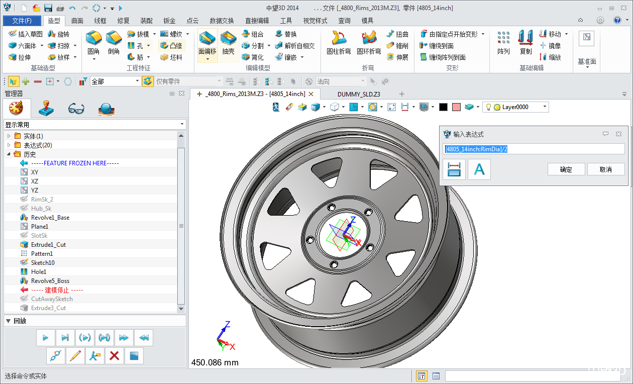 2. 轮毂的设计通过表达式控制尺寸,实现参数化设计。中望3D方便快捷的表达式驱动在整个轮毂设计中发挥了很大的作用,因为这个轮毂分别有13 inch和14 inch,而在这个作品中,只要建立相关的表达式,通过简单的数值输入就能快速生成两种尺寸的轮毂。而更关键的是其它刹车钳、联接轴等模型全部关联到此参数,只要轻松的修改,整个制动器的机构尺寸大小都会一起发生变化。