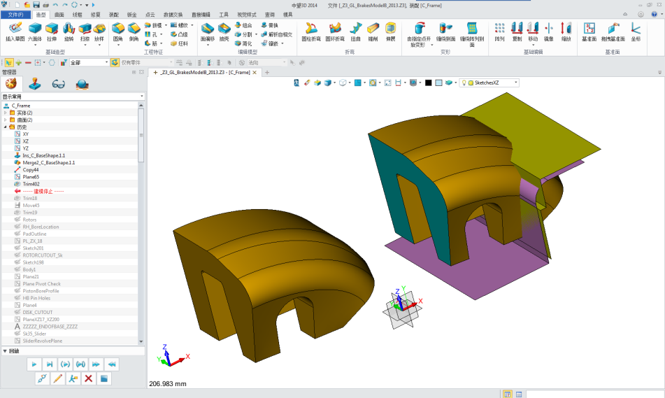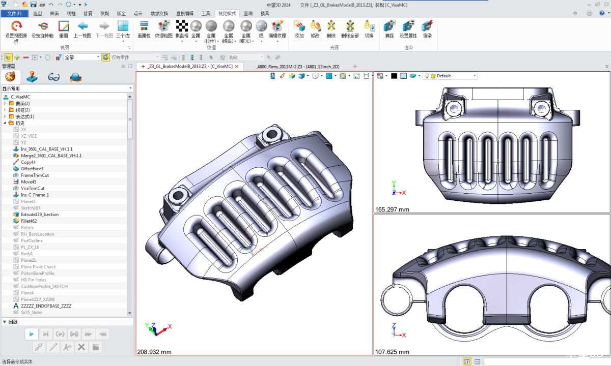 4. 刹车钳的设计花了不少时间,一方面是刹车钳的工程要求较高,对强度刚性有要求;另一方方面自己对曲面建模不是很熟悉。但是设计下来发觉中望3D的曲面还是相当不错的:首先单个零件支持多实体设计,其次实体和曲面的混合建模,显得更灵活自由,也确保能够获得想要的造型。最后中望3D在一些细节特征的设计上如倒圆角、孔等也表现出色,很好的在复杂的边缘倒圆角成功并且创建出符合GB的各种螺纹孔。