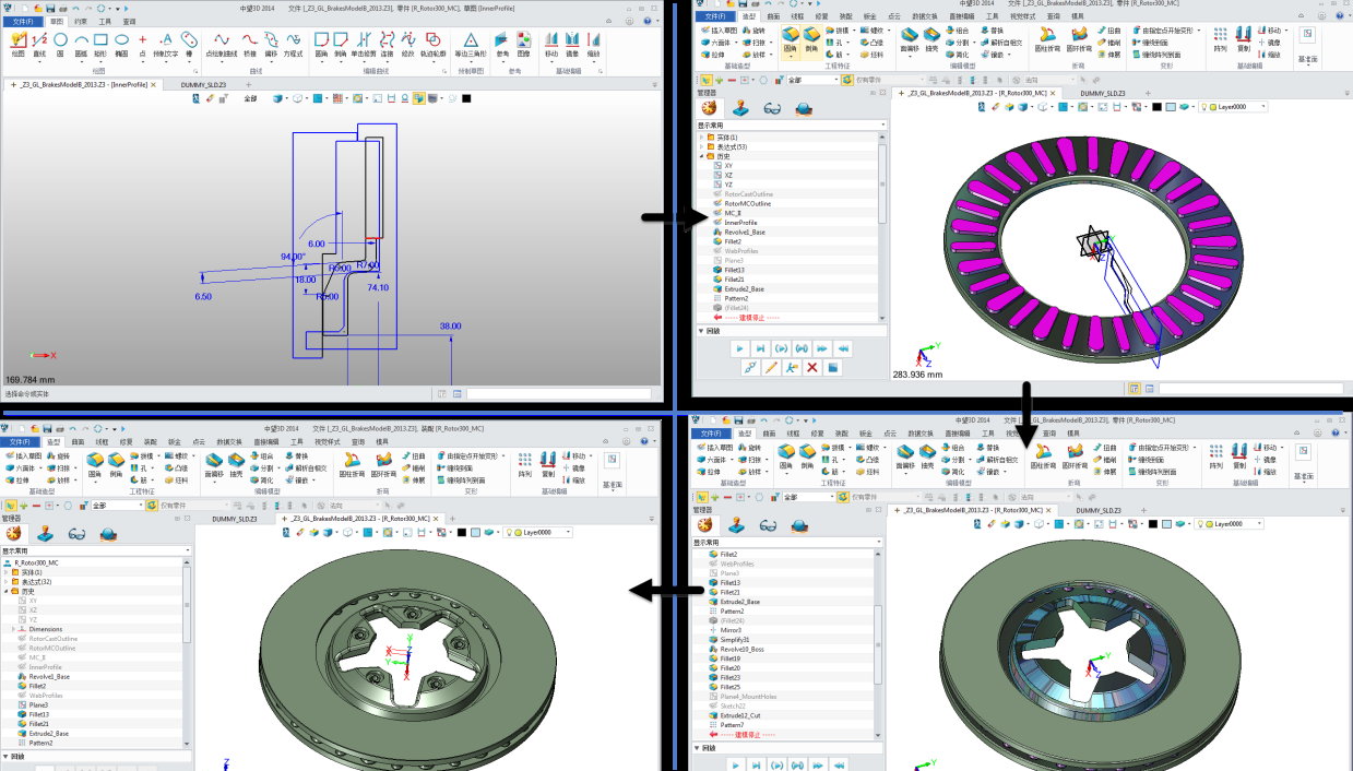 3. 制动盘的设计还是主要使用了大量的草图进行旋转。而不得不提的是中望3D里面的预制草图功能,里面有一些现成的常用的草绘线框,无需从头绘制,只需直接调用标注尺寸即可,这也大大节省了我的设计时间。