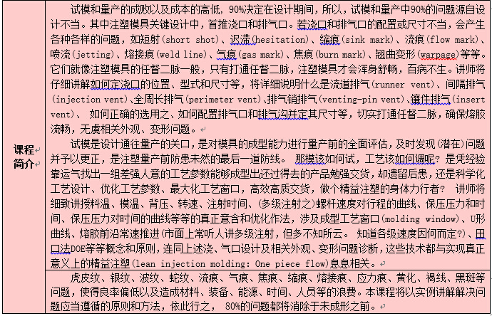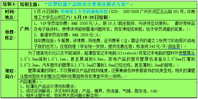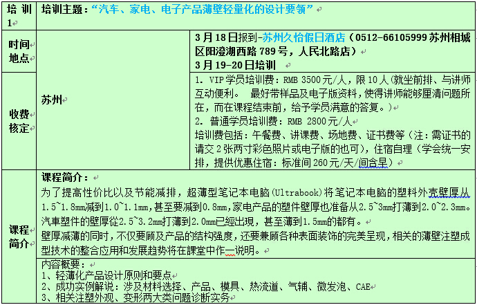 | 各会员、企事业单位: 自APEC会议的利好消息-“推动区域经济一体化”,“促进经济创新发展、改革与增长”,“加强全方位基础设施与互联互通建设”等重点议题,实现亚太和平、稳定、发展和共同繁荣!我国是制造业大国,已经具备很强的制造能力,但仍然不是制造业强国,总体上还处于国际分工和产业链的中低端,根本原因就是企业创新能力不强。如果能在“中国制造”前面再加上“中国设计”、“中国创造”,我国的经济和产业格局就会发生根本性变化。 推动企业成为技术创新主体,增强企业创新能力,就成为当前国人不可回避的责任。 以培训整军经武,藉学习出类拔萃,九合诸侯、一匡天下的愿景终将实现。 试模及量产时,经常遭遇的问题主要可分为两类:一是变形、二是外观。业者为此花费了可观的资源,却苦于良率偏低,甚至无法交货者比比皆是。 前述问题, 90%出自设计不良。 所以问题诊断(Trouble Shooting)和产品、模具与工艺设计(Part, Mold and Process Design)息息相关, 其间的因果关系,如果不能理顺,即使是劳民伤财、耗时经月,仍然难毕其功。 系列课程将以分门别类的案例解析方式涵盖并且衔接业者关心的问题诊断和产品、模具与工艺设计,并且兼顾Know-how(知其然)和Know-why(知其所以然)。 茅塞顿开、心领神会后,可以举一反三、闻一知十,从事研发、设计或诊误的工作,必能得心应手、无往不利。 讲师1979年开始就在美国从事CAE程序的撰写,对注塑的物理面有深入的了解,1983年开始将商业化的CAE应用到注塑业界,并且在北美、欧洲和日本推广相关技术,1989年回到亚太后,将其不断完善的兼顾理论和实务的系统化知识,经过顾问和培训服务传授并造福大众。讲师讲授的是标本并重、内外兼修的上乘法门,学员将学会如何以讲师独到而且有效的逻辑系统解决问题与开发产品,是欲穷千里目,更上一层楼的大好机会! 应业界要求,先进成型技术学会推出上半年培训计划。 欢迎业界因时因地制宜‧踊跃报名参加。 课程特色: 系统传授注塑成型的心法与技术。 课程实用,观念清晰,方法有效。 提高解析问题的能力。 减少材料、装备、能源、时间、人员的浪费,大幅提高品质、良率、生产力和营利率。 课堂中博采各行各业的实例帮助说明,学员如果愿意公开带来的样品,可以在转换成为教材后,在课程结束前,得到指点迷津、拨云见日的机会。 备注: 1. 为了让讲师早日了解您的企业和产品,请尽快缴交培训回执表、附相关问题说明; 2. 将培训费汇至学会指定账户(现场交费者请说明),方为有效报名。 曾受训单位: 北京隆轩、博西华、海信、康佳、富士康、罗斯蒂、罗技、天旗、敏实、LG、震雄、海天、金发、塞拉尼斯、燕山石化、壳牌、中新、TTI、大长江、华侨股份、毅昌科技、中达电子、美的、赢创德固赛、Moldflow、光宝科技、云天化、航材院、新普塑、BASF、ARBURG、上海赛科、威格斯、LS机械、华西泵业、茂名科翔、深圳宏商、纳诺人工晶体、三功轮胎、菲时特管业、煜明电子、英济电子、上海金纬、帝人、上海汇普、苏州博宇、钰航电子、三卓韩一、大鹏模具、苏威、开德阜、上海金昌、上海伊士通、怡东塑模、裕成电子、星宇车灯、绿点、安费诺、西安神力、福建工程学院、上汽、正泰、鸿雁电器、德力西电气、创维、永业电子、华生塑业、家联塑料、东洋电子、佛吉亚、南京德朔、南京志翔、道达尔、、江苏新泉、上海威虹、合兴集团、华中车灯、路博润、耐普罗、润法塑业、冠捷集团、超人电器、航天模塑、常州内饰件、北京中拓、兴瑞电子、宁波华翔、宁波华众、宁波双林、宁波富诚、宁波开翎、玛克特汽车饰件、合肥美菱、胡连电子、海泰科模具、迪爱生、三美电机、重橡汽车部件、歌尔电子、中瑞电子、思柏模具、宝理、沙伯基础、东风伟世通、瀚典热流道、三洋、荣事达、日立、延锋百利得、DSM、代傲电子、武汉美嘉、吉林石化、中石油、博创、百家丽、奥萨特、北京塑料研究所等知名企业。 如企业内训请提前1个月联系,以便安排师资,费用:2天6.5万元,老师差旅费企业自行负责。 培训讲师简介: 徐昌煜 (Charles Hsu) 2015. 1. 1. 学历:1982年获得美国西北大学(Northwestern University)机械工程硕士 1970年获得中原大学机械工程学士 经历: 2005 - 今 先进成型技术学会(Society of Advanced Molding Technology或SAMT)创会理事(Founding Director) 2005 - 今 模仁精密有限公司(MoldZen Precision Company Ltd.)董事总经理(Managing Director) 2008– 今 凌龙科技股份有限公司(变模温技术)监察人 2003– 今 中原大学模具与成型科技研发中心顾问 1991– 今 塑胶工业技术发展中心(台湾台中)注射成型课程讲师 1991 – 2005, 2014台湾区模具工业同业公会模具设计课程讲师 2011– 2013 合肥美菱股份有限公司 外聘专家 2011– 2012 泛亚汽车技术中心内饰模具暨成型工艺协会 总顾问 2008– 2012 常州市模具工业协会 荣誉会长 2005 - 2009 南京德朔实业有限公司(Nanjing Chervon Industry Co., Ltd.)高级技术顾问 2003 - 2008 香港震雄集团 (Chen Hsong Group)资深顾问 2006 - 2007 韩国YUDO CO., LTD(全球第一大热流道系统厂)顾问 2005 - 2007 济翔医材股份有限公司 (MedicalChain International Corp.)技术长(Chief Technical Officer)兼顾问 2004 - 2005 康佳集团(Konka Group)模具暨注塑技术高级顾问 2003 - 2005 模仁科技股份有限公司(MoldZen Tech