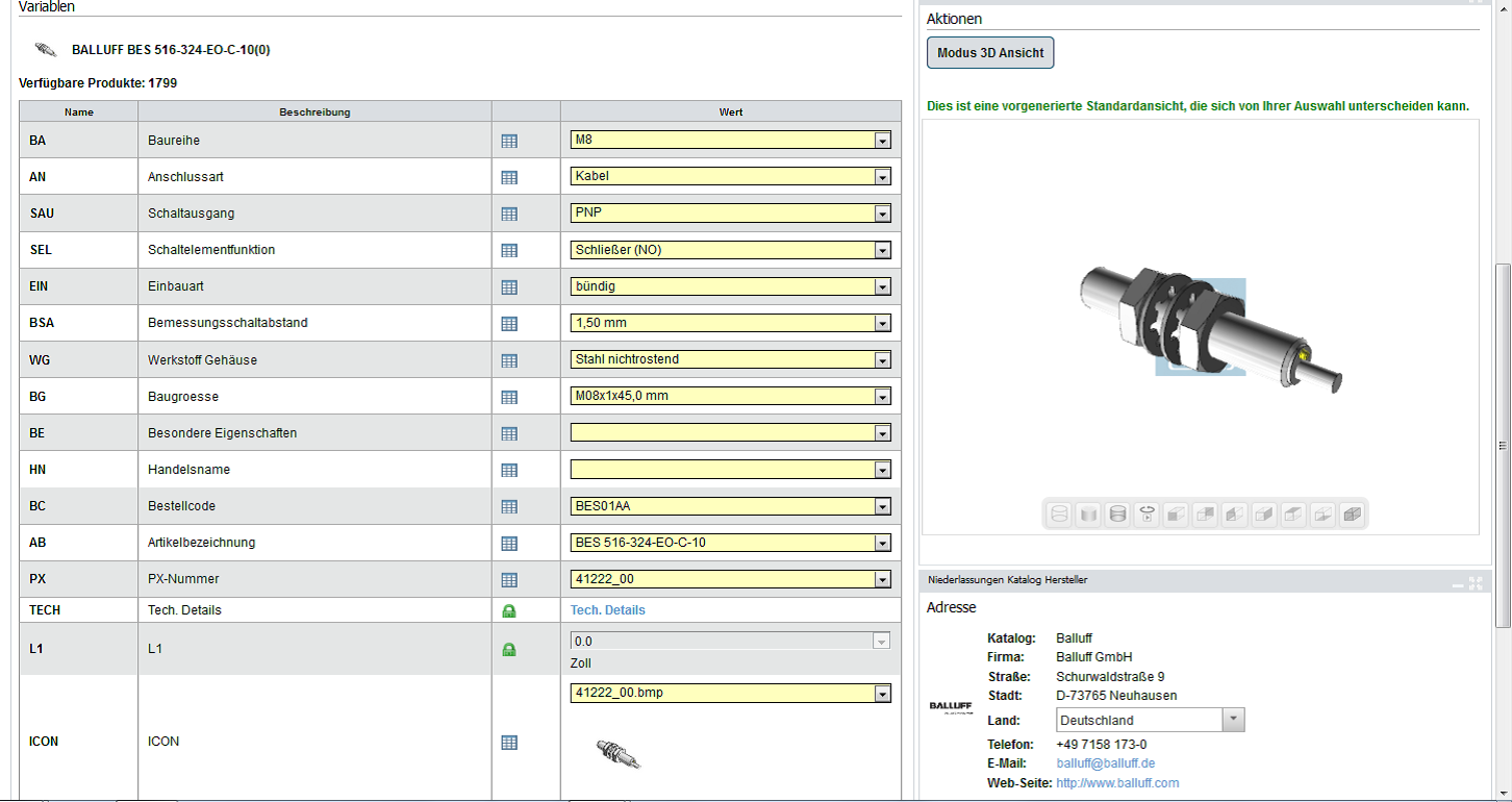 PARTcommunity平台用户通过定义参数可以方便地找寻零部件 BALLUFF产品选型助手为客户提供了多种可能, 以方便实现他们的设计方案. 即使是大海捞针, 通过产品选型助手也可以快速找到所需零部件. 在2014年CADENAS工业论坛中Anatol Kligermann先生曾介绍过, Balluff如何与CADENAS合作, 实现在产品选型助手帮助下快速查找零部件. 产品数量不断增加 产品数量不断增加Balluff GmbH是全球领先的传感器和连接器制造商, 拥有2600多名员工, 主要生产系列高质量传感器, 位移测量仪和RFID系统, 并提供自动化领域的专业网络解决方案. Balluff产品的CAD模型数量在2013年首次超过1万个. 至此Bulluff迫切希望找到一种解决方案, 便于客户在大量产品系列中进行选项, 简单快捷地找到所需零部件. 产品选型助手让选项变得快速而准确 Kligermann先生说: „针对数量庞大的产品数据来说, 首要的是需要一种快速而准确的搜索工具.对于那些非常熟悉产品并知道订购号或模型的用户来说,借助产品选型助手只需要点击几下就可以找到所需零部件." 产品选型助手让选项变得快速而准确 其它情况, 如用户非常了解产品特点, 但却不清楚订购号或产品模型. 通常他需要查看不同特征信息,才能找到合适的传感器,如„耐压"和3-4线"产品 该按照选项参数创建的新的产品选型助手. 通过变量配置不仅避免了不停搜索零部件工作量, 也明显减少了搜索所处理的数据量. 另外选型助手界面直观,操作方便. 产品目录以此保持了灵活性, 维护也变得非常简单. |