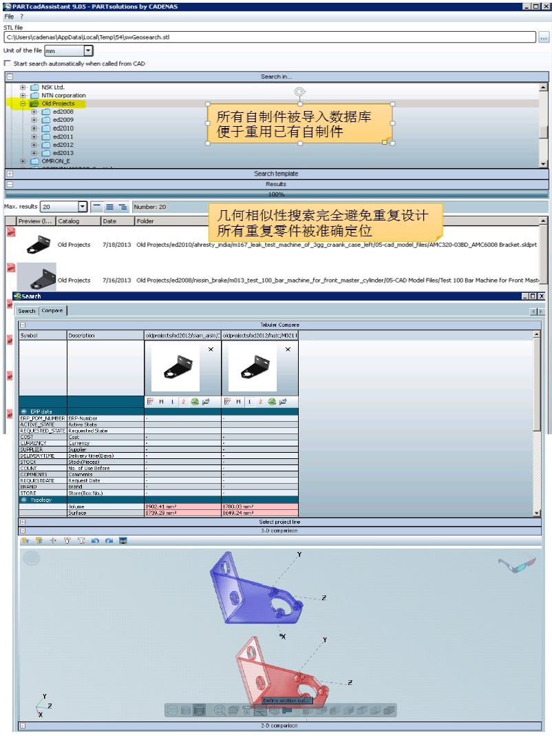 2013年, 从事机床设计和生产供应商Eureka公司采用CADENAS的PARTsolutions零部件数据管理系统, 成功地对企业现有数据进行整合, 不仅缩减了大量重复数据, 提高了标准化水平, 同时也有效提高了自有零部件的重用效率, 降低了管理成本. 项目背景 Eureka是泰国一家著名的主要为日本汽车制造企业的设备供应商, 尤其在机床设计和生产拥有独有的专业技术. 虽然在技术上领先, 但在零部件数据管理方面, 由于长期缺乏有效的工具和系统进行管理和支持, 零部件重复率, 新物料数量逐年攀升, 造成管理成本不断上涨. 经过多年积累, Eureka公司PDM系统下有超过50000个标准件,外购件及企业通用件, 它们被按照年份,客户及产品名称分类. 通常, 工程师会根据客户要求和标准以及之前相似的项目来进行产品三维模型设计. 但在实际设计过程中, 使用哪些零部件主要取决于设计师的经验和直觉, 这导致了大量不必要的重复设计和冗余数据. 由于工程师随意命名其设计的自制件经常会造成"一物多码". 公司多年积累起来的大量设计数据不但没能为工程师服务反而成为负担, 也造成了后期采购,生产,库存等各方面的大量浪费. 经过内部核算, 在Eureka增加一个新物料所带来的管理成本平均近2万泰铢(约 4000 人民币), 大量冗余数据所带来的成本压力使得管理部门不得不考虑, 对现有PLM系统下的零部件进行有效的管理,优化和缩减. 在选择零部件数据管理解决方案时, Eureka最终决定采用CADENAS的PARTsolutions零部件数据管理系统, 其中主要有以下几个因素: - 可以集中管理零部件的三维模型,二维图纸,图片及技术文档等, 还可以根据各部门的要求显示各种零部件信息, 如材质,价格,库存和状态等 - 对所管理的零部件可以智能化的自动检索分类, 尤其是对过去将近10年积累下来的所有设计数据 - 系统中应该包括公司常用的标准件和供应商零件库如Misumi, SMC等等并保持更新 - 可以和公司目前使用的设计系统(CAD+PDM+ERP)集成, 零部件信息获取简单快捷 - 较高的数据安全性和稳定的后期维护 通过PARTsololutions可以把企业目前以工程师为核心的产品设计流程, 规范为严格的标准化设计流程, 并最终实现模块化设计. 项目实施 在Eureka采用服务器客户端布置安装PARTsolutions, 同公司目前使用的设计系统, SOLIDWORKS/EPDM/ERP等借助接口程序实现无缝集成. PARTsolutions在为Eureka提供庞大而完整的标准件和外购件库的同时, 也将Eureka从2008到2013年积累的自制件库纳入其中进行有效管理. 工程师借助PARTsolutions, 可以方便地调用和比较各种数据包括预览,技术资料,三维模型及相关的二维图纸等. 同时将PARTsolutons提供的各种功能融入到企业现有的业务流程中, 同企业现有CAD\PDM\ERP系统完美集成. 项目实施成果 - 协同标准化及采购部门规范新物料的审批开放流程 在PARTsolutions中, 将Eureka的零部件设置屏蔽和开放状态, 工程师在设计之初就可以在众多候选的零部件中, 直接使用那些带有绿色标识, 已经经过审批和优选的零部件. 设计与采购部门在同一平台协同工作, 在满足设计需要同时, 协助采购部门实现集中采购, 供应商优选从而降低成本.另外, 如果设计需要, 工程师要调用红色标识的零部件, 则必须向项目负责人提出申请, 通过审批后, 经过相应流程才可开放所需零部件. PARTsoluions的接口程序会自动把该零部件检入PDM系统并设置相应的PDM状态, 零部件实现了标准化管理. - 迅速锁定已有零部件或相似设计实现100%重用和缩减 工程师创建新零部件之前, 在Eureka零部件库中必须进行搜索. PARTsolutions提供的各种搜索功能为快速锁定所需零部件提供了保障, 如关键字搜索, 变量搜索, 草图搜索, 拓扑搜索等. 其中几何相似性搜索是将工程师绘制的带有主要特征的零部件CAD模型作为搜索项, 在已有零部件库中进行模型搜索和比对, 只需数秒钟就可以报告, Eureka的PDM系统下是否存在相同或相似的零部件. 在提高重用, 避免重复的同时, 大大节省了设计及后期成本, 由此Eureka的内部零部件数量缩减到10000个左右. PARTsolutions在Eureka的成功应用得到了其管理层的高度评价, Eureka的零部件数据不仅实现了零部件标准化管理, 提高了重用效率, 多年的知识积累和数据资源成为真正的财富; 而且Eureka的研发效率也随之得到了显著提高, 设计和采购部门协同工作, 开发和采购成本从源头上得到了控制和降低. 另外, Eureka对于CADENAS的实施服务业非常满意, 三分软件七分实施, CADENAS本地化的专业实施服务, 强大的研发能力及后续支持为Eureka项目的成功提供了有力保障. Eureka公司简介 总部位于泰国曼谷的Eureka公司(Eureka Design Public Company Limited) 为汽车和摩托车制造企业提供优质的产品和服务, 是东盟经济共同体中十大汽车装备公司之一. Eureka之所以能超越竞争对手成为众多大型日本汽车制造企业的设备供应商, 与其超过10年持续的投入和开发, 尤其是在机床设计和制造领域具有的独特的创新精神密不可分. |