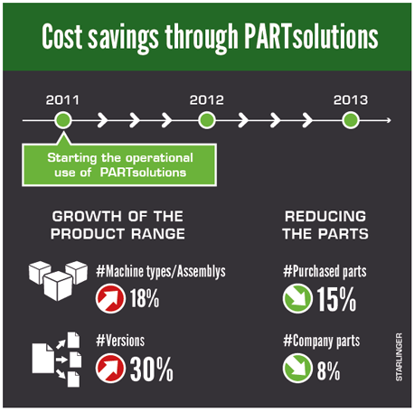 设计开发阶段零部件的高效重用完全归功于PARTsolutions Langfristige Kosteneinsparung bei Starlinger2011年Starlinger & Co. GmbH成功引入PARTsolutions零部件数据管理系统. 不仅可以快速方便地找到和管理企业零部件数据, 而且还有效降低了不必要的新物料, 从而降低了企业成本. 同时PARTsolutions的优化下, 采购和设计之间实现了紧密合作. 两个部门都可以共享零部件的完整技术和商业信息. CADENAS把该模块定义为PURCHINEERING,即英文„采购“和„设计“ 的组合词. Starlinger & Co. GmbH是生产塑料袋机床设备领域的龙头企业. 公司位于维也纳, 在奥地利北部生产经营已经45个年头, 员工550人, 客户遍布136个国家和地区. Starlinger产品线涵盖生产塑料袋的所有设备. 整个产品生产都是运作在庞大的流水线上. Präzisionskreuzspuler linTAPE 在未引入PARTsolutions前,Starlinger是采用关键字搜索方式在ERP和PDM系统中搜索零部件信息. 由于管理职能分离使得Starlinger非常需要一个专业的零部件数据管理系统, 在设计开发阶段来有效控制和管理零部件. 来自PARTsolutions的支持 应用PARTsolutions后的结果让人非常满意– CADENAS奥地利公司经理Karl Rippel进行了介绍: „Starlinger对于PARTsolutions的搜索功能非常满意, 特别是几何相似性搜索. 只需几秒钟GEOSearch就可以呈现搜索结果并包含来自ERP和PLM系统的关键信息非常便于选择合适的零部件. 工程师大大节省了打开不同系统进行查找的时间. 在引入PARTsolutions后Starlinger不仅避免了大量不必要的新物料生成. 零部件重用比例也大幅上升. 最初,在设计部门对于PARTsolutions的接受程度是有差异的. 应用后其呈现的高效搜索和令人满意的搜索结果打消了之前大家的顾虑.“ 在节省时间方面, 每个工程师通过搜索功能至少每天节省15分钟时间. 换算为金额的话, 每小时50欧元, 那么每年在人工成本上就节省近112000欧元. 效率提升和成本降低 整个项目负责人, 也是Starlinger部门开发和流程优化负责人Raimund Horvath总结说: Cost saving through PARTsolutions„在引入PARTsolutions后新物料的增长降低了近10%. 尽管随着项目新物料不断增加, 但是物料增长幅度在逐步下降. 在PARTsolutions帮助下, 我们的内部流程特别是零部件搜索和新物料管理方面得到了显著优化. 另外基础数据的质量也明显得到改善, 有效增加了标准件的使用, 同时也增加了那些优先级的供应商数据的使用.“ |