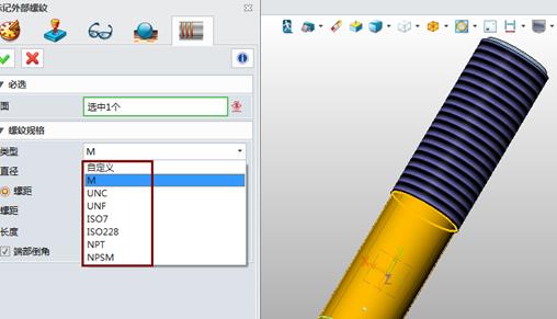 在机械产品中,螺丝是必不可少的紧固件。设计过程中,对于标准的螺丝,设计师可以直接从三维CAD软件的零件库中调取使用,但非标准的螺丝就需要设计师根据实际要求去重新设计绘制,而其中,螺纹就是最常用到的CAD设计命令。 螺纹旋合有三个参数非常重要:旋向、螺距、螺纹规格,内外的两个螺纹只有在这三个参数满足同时一致的前提下,才能进行装配。因此,设计螺纹所用的三维CAD软件也必须遵循这个原理来进行操作。 中望3D作为国内高性价比的专业三维CAD软件,为用户提供专业、高效便捷的操作体验。在创建螺纹方面,中望3D不但操作便捷,同时也完全符合螺纹设计的相关国内、国际的标准。 下面我们将向大家介绍下中望3D在螺纹设计方面的操作步骤以及相关注意事项。 如图1所示,中望3D的螺纹生成操作命令是在“造型”模块中,其具有两个操作命令:“螺纹”和“标记外部螺纹”。 图1 中望3D螺纹命令界面 其中“标记外部螺纹”是在圆柱面上增加螺纹属性,三维实体里显示的是螺纹的贴图,这样可以减少一部分运算量,提高运行效率;而螺纹命令,是通过围绕圆柱面旋转一个闭合轮廓,并沿着其线性轴和方向创建一个螺纹造型特征,设计师们可以根据实际运用情况与基本体进行布尔运算,如图2所示,布尔加减运算所生成的效果也是所有不同的。 图2 操作螺纹命令时,布尔加减运算的不同效果视图 进行螺纹设计时,设计师可单击工具栏中“造型”模块的“螺纹”命令,系统则会弹出“螺纹对话框”,如图3所示,其操作原理与是其它常用的三维CAD设计软件一样,也是通过定义螺纹旋合的三要素(即旋向、螺距、螺纹规格)来生成螺纹的。不同的是,中望3D螺纹操作中参数的设计与其他三维CAD软件相比,要简便优化得多,这样设计师在操作过程中,就不会因为参数设计太过繁琐而容易出错。 图3 螺纹设置对话框 关于必选栏中的定义选项的真正意义和用途如下: 面 F:选择圆柱面。 轮廓 P:选择螺纹的轮廓。可选择一个草图、曲线、边或一个曲线列表,也可以单击右键,来制作一个曲线列表。此参数决定螺纹规格及类型。 匝数 T:螺纹旋合圈数。 距离 D:螺纹每圈的间距,也就是螺距P。 顺时针旋转:默认状态下是逆时针螺纹,如果选择此复选框则将改为顺时针螺纹。 反螺旋方向:定义螺纹拉伸轴向的方向,勾选后和当前的反向。 另一个操作命令“标记外部螺纹”,点击后即会弹出想对应的操作对话框,如图4所示。通过该命令创建的螺纹不具有三维实体的效果,而是以贴图的方式显示,但是在生成工程图的时候则会具有螺纹属性。 图4 标记外部螺纹设置对话框 螺纹规格的几个参数定义: 类型:生成螺纹的标准类型,注意这里默认的螺纹直径是圆柱的外径。 直径:圆柱的外径。 螺距:这里的参数是根据不同的标准自动生成的,若要设计非标零件可以自行设置参数。 需要强调的是:设计螺纹过程中,设计师一定要确定好螺纹的外径是否符合自己的要求,尤其是进行布尔加运算的时候。 中望3D所生成的螺纹,不管是实体3D螺纹还是虚拟的修饰性螺纹,都是按照国标、欧标等常用标准来进行生成的,是完全符合实际运用的螺纹。图5中即是修饰螺纹的效果图,红色方框标记的下拉菜单则为目前通用的标准。中望3D的标准化参数设计,代替了一大部分的自主参数设定,这种更加智能化的操作方式,不但操作起来更加便捷,也大大地提高设计师们的工作效率。 图5 修饰螺纹的效果图 综上所述,中望3D的螺纹设计具有实用、智能便捷、容易上手的操作特点,能帮助设计师大大降低特征出错的概率,提高设计效率。 三维CAD设计软件中望3d免费下载://www.zw3d.com.cn/product-58-1.html |