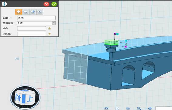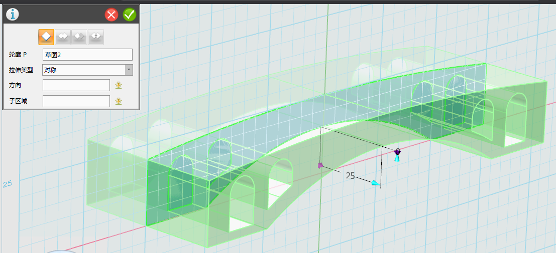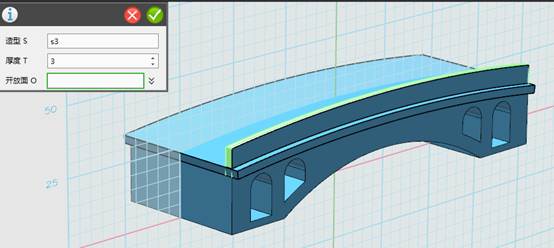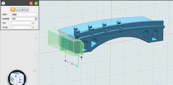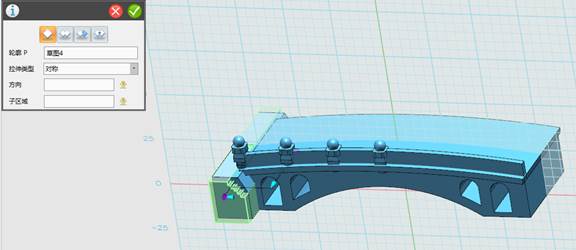 “ 创客”成为2015年十大流行语之一,表明科技 创新在当下深受重视。处在科技前沿的 3D打印设计技术,也逐渐进入中小学课堂,中小学三维创意设计课程开展得如火如荼。学生们通过简易操作的3DOne三维设计软件,将创意展现出来;老师们通过3DOne软件设计小课件,让课堂更加生动有趣。这次,我们将3D设计一个语文小课件——赵州桥。河北赵县的赵州桥始建于隋朝,距今已有1400多年历史,是中国第一座石拱桥,也是全国重点文物保护单位。下面我们来看看具体的设计步骤: 1. 选择点击“草图绘制” ,进入草图,绘制如下草图,完成后,点击上面的“ ”退出草图。2. 选择点击“特征造型” 中“拉伸” ,将步骤1中的草图进行拉伸,拉伸类型选择“对称”,厚度输入“25”,勾选确认,如图所示:3. 选择点击“特征造型” 中“拉伸” ,选择桥面上的圆弧边线进行拉伸,拉伸类型选择“2边”长度分别输入“3”和“-53”,勾选确认,如图所示:4.选择点击“特殊功能” ,中的“抽壳” ,选择步骤3中的拉伸面,厚度输入“3”,勾选确认,如图所示:5.选择点击“特征造型” 中“拉伸” ,选择桥面上的圆弧边线进行拉伸,拉伸类型选择“1边”长度输入“12”,方向选择桥身边线,图上箭头所示,勾选确认,如图所示:6. 选择点击“特殊功能” ,中的“抽壳” ,选择步骤5中的拉伸面,厚度输入“3”,勾选确认,如图所示:7.选择点击“基本实体” 中的“圆柱” ,中心位置的选择,单击鼠标右键,在弹出的菜单中选择“中间”,再选择护栏上的边线,如图所示圈内的线,然后选择“对齐平面”,选择一水平面,如图“箭头”所示,并输入圆柱的半径“3”和高度“1”,勾选确认。 8.选择点击“基本编辑” 中的“阵列” ,将步骤7中的圆柱阵列,数量“4”,距离“3”,方向如箭头所示,勾选确认。9.在过滤器中选择“曲面” ,然后安装“ctrl”键,选择第二个和第四个圆柱的侧面,选择“偏移”,输入“-0.3”