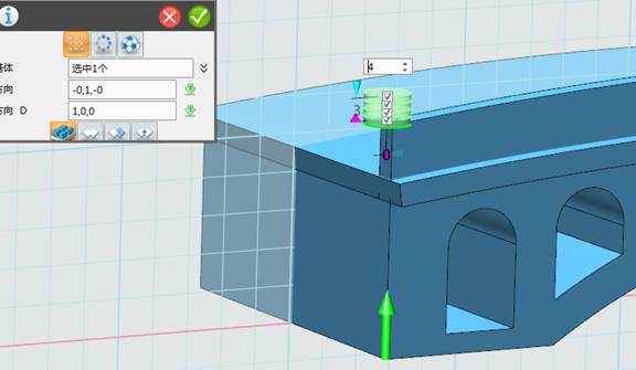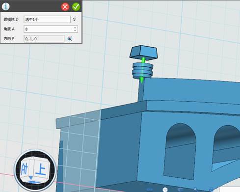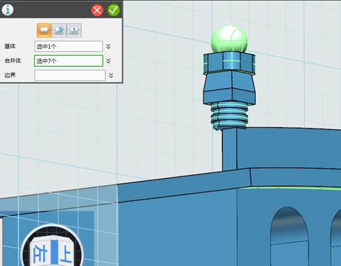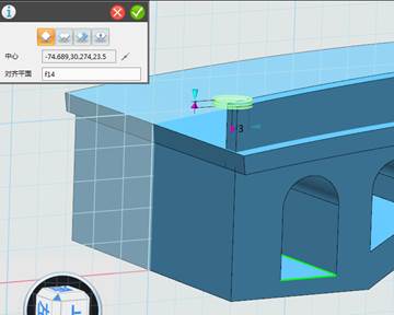 10.选择点击“基本实体” 中的“六面体” ,中心点的选择,单击鼠标右键,在弹出的菜单中选择“曲率中心”,在点击第一个圆柱的边线,自动捕捉到圆心点(参考步骤7),“对齐平面”如图拱桥下平面,同步骤7,长宽“6”,高“2”,勾选确认。11.单击选择“特征造型” 中“拉伸” ,选择步骤10中的六面体上表面进行拉伸,拉伸类型选择“1边”长度输入“3”,勾选确认,如图所示:12.在过滤器中选择“造型”然后将步骤10中的六面体隐藏,选择 选择“特征造型” 中“拔模” ,对步骤11中的拉伸体进行拔模,拔模体选择 下表面,角度输入“8”,勾选确认。13. 单击选择“特征造型” 中“拉伸” ,选择步骤12中的六面体上表面进行拉伸,拉伸类型选择“1边”长度输入“-3”,勾选确认,如图所示:14.选择步骤13中的六面体侧面进行偏移,(参考步骤9)输入值“1”,勾选确认。 15. 选择点击“基本实体”中的“球体”,在步骤14中的六面体上建立一个球,半径“3”,位置可拖动鼠标移动,勾选确认。 16. 选择点击“特征造型” 中的“圆角” ,对步骤14的六面体,圆角,半径“2”,勾选确认。17. 选择点击“组合编辑” ,将上面所以的圆柱,六面体,圆体,合并成一个体,基体选择圆球,合并体选择其余的六面体,圆柱体,勾选确认。18. 选择点击“基本编辑” 中的“移动” ,拖动箭头将合并体,向下拉至合适的位置,确认。 19.选择点击“基本编辑” 中的“阵列” ,将步骤18中的合并体阵列,数量“4”,距离“75”,方向如箭头所示,勾选确认。20. 选择点击“草图绘制” ,进入草图,绘制如下草图,完成后,点击上面的“ ”退出草图。21. 选择点击“特征造型” 中“拉伸” ,将步骤20中的草图进行拉伸,拉伸类型选择“对称”,厚度输入“35”,勾选确认,如图所示:22. 选择点击“草图绘制” ,进入草图,绘制如下草图,比例协调即可,完成后,点击上面的“ ”退出草图。 23.选择点击“特征造型” 中“拉伸” ,将步骤20中的草图进行拉伸,拉伸类型选择“对称”,厚度输入“40”,勾选确认,如图所示:24.合并步骤22和23的拉伸体,并将步骤19的阵列体,移动至合适位置,参照步骤17和1,8,如图所示: 25.做图示两个拉伸面,如图所示 26. 选择点击“基本编辑” 中的“镜像” ,选择上述两个合并体,圈内所示平面选择图箭头所示,勾选确认。27.同理,将护栏上的所有合并体镜像到桥的另一侧。选择合并体,圈内所示平面选择图箭头所示,勾选确认。 28.最后,对图形进行渲染,点击选择“材质渲染” ,选择自己喜欢的颜色吧。渲染后结果 【赵州桥 模型下载】//www.i3done.com/model/56399.html#ad-image-0。 【趣味活动】完成的作品可参加“梦想实验室让创意成真:免费3D打印活动”//www.i3done.com/contest/show/20.html 。 3DOne免费下载及更多课程详情:www.i3done.com