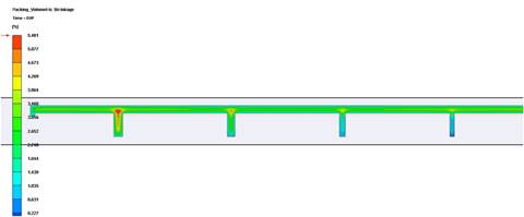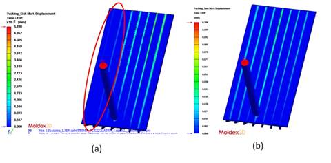 在塑料产品日益迈向轻薄短小化的同时,强度与外观之间仍必须取得适当的平衡。在产品的结构设计上,经常使用肋条(Rib)来增加强度,然而肋条与产品连接处因为肉厚差异容易导致局部不均匀收缩,在产品表面形成凹痕(Sink Mark)。除了产品的几何外型,凹痕的产生也与保压条件有密切相关。面对这种外观瑕疵,传统的解决方法多为依赖现场师傅多次的试模经验,才能找到最佳制程参数,减少产品表面凹痕。 然而在市场高度竞争下,产品结构日趋复杂,生命周期越来越短,现场师傅的经验往往不足以应付,多次试模不但降低效率,成本也相对提高。Moldex3D软件提供预测产品凹痕位移(Sink Mark Displacement)功能,依照产品几何与塑料在保压阶段的收缩行为,计算出产品表面的凹痕位移,真实反应产品射出后的凹痕缺陷,确保在实际开模前,设计变更与制程参数都可以获得优化。 图一为应用Moldex3D预测凹痕位移的实际案例。塑件由一平板与四支不同宽度的肋条组成,肋条宽度由粗到细依序为1.8 mm、1.5 mm、1.2 mm、 0.9 mm。 图一 由一平板与四支不同宽度肋条组成的案例几何 根据保压阶段的体积收缩率模拟结果(图二)显示,主平面体积收缩率分布均匀,然而在肋条与主平面衔接处,局部厚度差异导致体积收缩率分布不均,且宽度越宽的肋条,体积收缩率越大,这些区域的表面也是最容易发生凹痕的位置。 图二 体积收缩率模拟结果 图三为Moldex3D模拟凹痕位移与实验凹痕结果比较图。实验结果显示,宽度越宽的肋条,表面凹痕越深,与模拟结果趋势相符,印证了Moldex3D在凹痕缺陷预测上的准确性。 图三 (a) Moldex3D对凹痕的模拟结果;(b) 实验结果的凹痕分布 (Ref: SIMULATON AND VERIFICATION ON PART SURFACE QUALITY USING EXTERNAL GAS-ASSISTED INJECTION MOLDING PROCESS, S. -C. Chen et al.) 为了能在复杂产品几何上仿真表面凹痕,Moldex3D持续精进预测凹痕位移的能力。以肋条倾斜的几何为例(图四),体积收缩率分析结果显示,产品有局部收缩不均匀的现象,因此可预期产品表面会产生凹痕。 图四 (a)肋条倾斜的案例几何;(b)体积收缩率模拟结果 图五为Moldex3D传统版本与新版本凹痕位移结果比较,可看出相较于传统版本,新版本能够更准确的模拟出肋条局部收缩导致的表面凹痕现象。 图五 (a)传统版本Moldex3D凹痕位移模拟结果;(b)新版本Moldex3D凹痕位移模拟结果 Moldex3D提供凹痕位移预测功能,且因应产业趋势变化,持续不断投入研发能量,针对特殊产品几何作改善,提升预测能力,协助使用者在实际试模前就能预测产品的外观缺陷并实时修正,大幅减少试模成本、缩短上市时程。 |