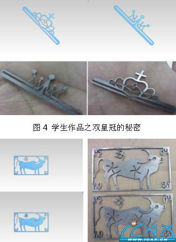 3.5 适应各种机床的后处理和拓展功能 可以根据各种机床的代码格式,来进行后处理文件的修改,从而适合不同加工机床的需求。软件还提供插件等拓展功能,增强了软件的使用功能。 4 结束语 由于FeatureCAM的易用性,使得在教学中软件的使用不再是难点,从而让学生在图形的设计创新上投入更多的时间。各种各样的图形,一些标志,跟他们自身相关的、周围有关的事物,都跃然纸上。以下附一些学生线切割作品(见下面系列图)。