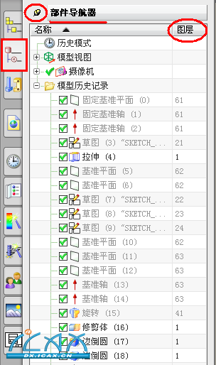 【前言】本节将介绍NX软件的模型导航器 【关键词】导航器,建模次序 在使用NX中,我们习惯将部件导航器打开,方便我们查看模型建立步骤和对模型构建特征或者次序编辑修改,下面我们介绍NX部件导航器的应用。打开NX文档NX_layer.rar,进入建模模块,练习导航器操作 在资源条中选择部件导航器图标,可以弹出部件导航器,当我们鼠标移开后导航器自动收起,那么我们希望导航器一直在弹出状态应该怎么操作呢?在导航器左上角有个图钉 ,我们点击下是图钉变成 形状,则导航器始终在弹出状态。 导航器中显示的信息包括(历史记录,视图,摄像机,表达式和模型的建模历史顺序等) 历史记录,这个是NX6新增加的功能,它可以使带有参数记录的模型变成非参的模型,后期做的任何操作都没有特征记录。 注意:这个操作是不可逆的,也就是,你可以将带参数的模型变成非参,但是不可以将非参的模型变回参数模型。 在导航器中鼠标移动到历史记录,按右键,弹出菜单,选择无历史记录模式,绘图区会出现警告框,提示操作导致非参。点击“是”,那么导航器内将显示一个非参模型实体。