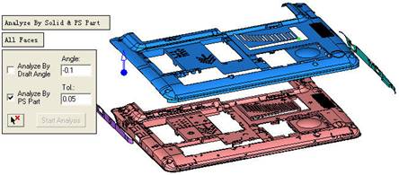 当有些造型复杂的模具项目造成协同工作的双方的工作量明显不均衡时,工作量少的一方完全有能力为另一方承担部分设计工作。 2、快速分模 CimatronE的分模不必基于完全封闭的实体,任何造型哪怕含有烂面、破面,CimatronE都能快速地将其分开。这就取消了必须在项目开始初期就要对产品数据质量做修复的限制。以往修复数据质量不好的产品可能需要花一天甚至更多的时间,而其它岗位的工作只能停滞等待。而现在设计模架、备料、设计部分镶件斜顶等很多工作就无需因产品数据修复而等待了。