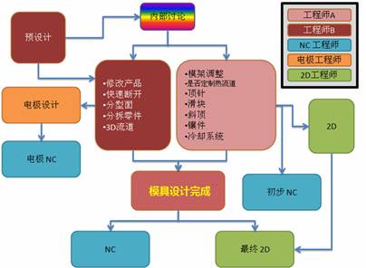 一、一体化的模具设计制造流程 全3D的设计思路为整个模具单位带来的是流程上的改变。和以往用3D软件拆模、2D软件设计模具结构、NC软件编程相结合的工作方式相比,CimatronE全3D的设计模式体现了更大的优势。 1、高效能的岗位间合作 现在部门上下各个相关岗位之间都使用CimatronE进行技术沟通,无疑既节省了沟通的时间,又避免了沟通的障碍,而且还为公司降低了因沟通失误而造成经济损失的风险。 同一软件在拆模、结构、电极及NC等不同岗位间传递工作、检讨确认,尤其是在修模设变时无需再反复地转档或打印图纸。工程师们也因能使用同一软件而在相互沟通时能快速清晰地表达自己的意思和了解对方的意图。此外,设计改动时前工程的员工完成自己的工作后即使与后工程疏忽了交接,后工程人员打开文档工作时,软件至少也能自动检测到改动而给予警告提示。