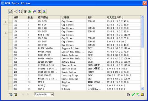 此外,使用标准件插入的方式,也提高了公司库存标准件的使用率。 4、自动生成BOM表 CimatronE能在设计过程的任意时刻实时、自动、一键式地生成Excel等格式的BOM表。因此项目开始初期,实时地输出一次BOM表即可用于模架板件的备料。到设计中期,约第二天时,再次输出BOM表即可用于镶件、斜顶等零件的备料。设计结束时再次输出最终的BOM表以配合仓库和现场指导相关工作。