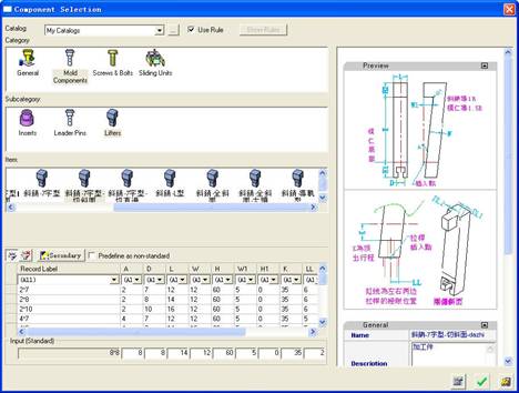 3、客制化的模架和标准件 CimatronE除了软件自带的LKM、Futba 、Hassco等三十多种品牌模架或标准件3D外,也支持客户创建适合自身使用的模架和标准件。这些模架、标准件能在每次模具设计时被直接调用,其参数可以被调整,也能和其它参数进行关联。所以每次模具设计只要用一两分钟的时间来设定少量的、不超过三十个的参数,整套模架及其大部分标准件便能调整准确。这与以往结构人员用2D软件绘制组立图相比,显著地节约了结构设计时间。