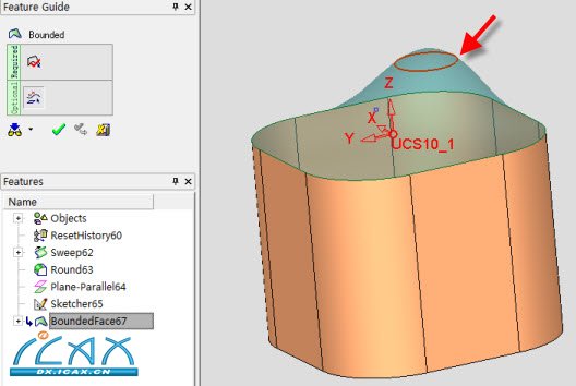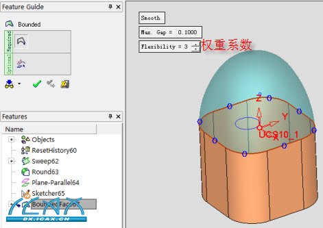 边界曲面也可以理解为封闭曲面,针对一个轮廓而做出的曲面,曲面的边界就是所选的轮廓。 既然是边界曲面,当然必须先有一个边界,如下图高亮显示的轮廓(这个轮廓可以是封闭的,也可以是开放的,如果是一条条的单线,必须先将其组合,因此,这个轮廓可以是草图,也可以是组合曲线) 启动边界曲面指令,点选此轮廓,就可以做出如所示的边界曲面了。 值得注意的是,下面这个选项 如果将此选项点击,曲面会变成如下的样子,意思就是边界曲面以相邻的曲面的切向斜率来定义。做出来的边界曲面效果就是与所选择的边界的相邻曲面成切向。 我们可以修改一下权重Flexibility,默认是5,我们可以调节这个数字,图素有相应的变化。 再来看边界曲面里的这个选项 此选项的作用是:将边界曲面改为通过所选的图素,所选图素可以是点、线、组合曲线或草图 图中的圆是在平面之上10MM的位置,我们现在将通过图素的选项定义为这个圆,来看看效果如何。。 再继续定义一个点,来看效果。 |