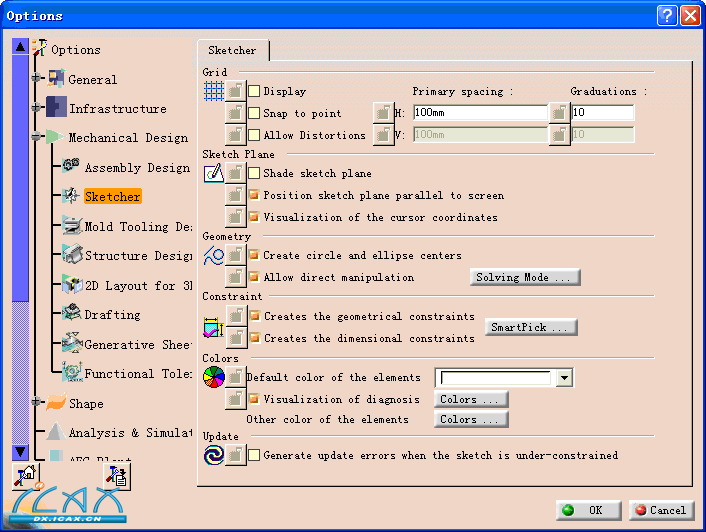 CATIA V5草绘(SKETCHER)使设计者可以精确且快速地绘制2D轮廓,全参数化的草图约束,更加方便图形的修改。有参与无参的使用,使图形在变更时更加方便。 Tools->Option->Mechanica->Sketcher打开SKETCHER的环境参数设定界面,用来设定不同的参数。草绘设置界面如下: 2.11 网格显示参数 (Grid) 1)网格显示(Display):选上该选项,可以在草绘环境里显示网格线。 2)网格捕捉(Snap to point):选上该选项,可以智能捕捉到网格的交点与曲线的端点。 3)允许变形 (Allow Distortions):定义网格H间距和V间距是否保持同样的数值。 4)H 间距 (H Primary spacing):如果不勾选 (Allow Distortions)的话,H间距跟V间距将保持相同的数据,勾选的话可以设置不一样的距离。 5)H 刻度 (H Graduations):默认值是10,在每一个H V间距里,再分10个刻度。 6)当勾选允许变形(Allow Distortions)选项时,V值选项激活,可以输入不同的V值间距与V值刻度数值。如果不激活,V值间距与刻度数相等于H值。 2.12 草图平面 (Sketch Plane) 1)草图平面着色 (Shade sketch plane):选上该选项,进入草图时,绘制的平面将多一个着色的平面。 2)将草图平面定位为与屏幕平行 (Position sketch plane parallel to screen):默认勾选,如果不勾选,进入草绘后,视图方向将保持与当前视图相同。 3)可视化光标坐标 (Visualization of the cursor coordinates):定义是否在几何图形内的光标附近显示光标坐标。 |