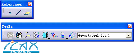 本小节本是属于创成式外形设计 (Generative Shape Design)工作台的学习内容,但考虑到零部件设计 (Part Design)工作台也离不开基准的参考,而且频繁的使用到这些指令,所以本小节以基准先入比较合适! 本小节的内容涵盖了基准点  、直线  、基准平面  、基准坐标系  的创建!其中点、直线和基准平面指令可通过下拉菜单的视图 (Wiew)>工具栏(Toolbars)>参考元素Reference Elements (Compact)工具栏获取访问(图3-21);基准坐标系指令可通过下拉菜单的视图 (Wiew)>工具栏(Toolbars)>工具(Tools)工具栏获取访问(图3-21)。