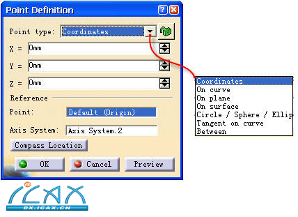 1.“坐标 (Coordinates)”点创建。 是系统默认的创建点类型。该类型允许用户以当前坐标轴系创建直角坐标点;如有需要用户可以通过参考栏(Reference)的点(Point)选项和轴系(Axis System)选项来定义参考点与坐标轴系。