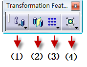 1) 平移 (Translate)  平移 (Translate):平移几何体,不保留原来的。  旋转 (Rotate):旋转几何体,不保留原来的。  镜像 (Symmetry):镜像几何体,不保留原来的。  轴对轴转换(Axis to Axis):参考坐标系转换几何体,不保留原来的。