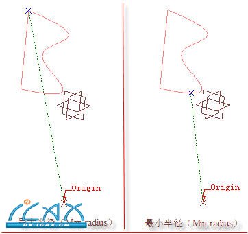 用户需要在“轮廓(Contour)”选项中定义一条平面曲线作为检测极值的几何,同时还需在“支持面(Support)”选项中指定平面曲线所在平面作为放置支持面,最后在轴系(Axis)栏的“原点(Origin)”选项中定义一个参考点,三个必要元素定义后创建方可生效,图4-211列出了“最大半径(Max radius)”与“最小半径(Min radius)”为计算方式所创建的结果。