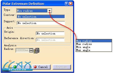 4)极坐标极值 (Polar Extremum)点创建。通过选择一个轮廓及其支持面、一种计算方式和一个参考轴系(原点和方向)。用户可根据需要在“类型(Type)”对话框的下拉箭头中选择不同计算方式,如图4-210所示。
