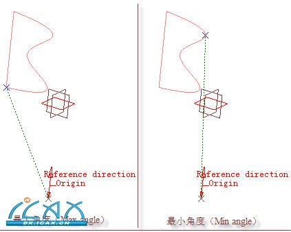 如果用户选择的“类型(Type)”是“最大角度(Max angle)”或“最小角度(Min angle)”为计算方式时,“参考方向(Reference direction)”选项卡将变成显式可用,用户必须为该选项定义一个作为角度的参考平面。图4-212列出了“最大角度(Max angle)”与“最小角度(Min angle)”作为计算方式所创建的结果。