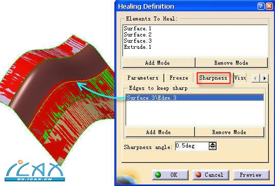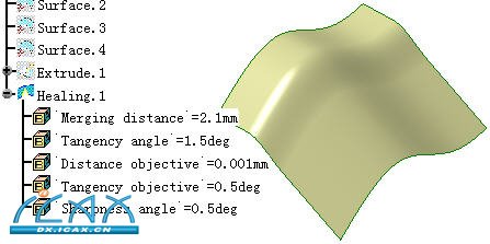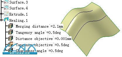 所需元素定义后,单击“确定 (OK)”创建修曲面,修复曲面(标识为Healing.xxx)即被添加到特征树中。