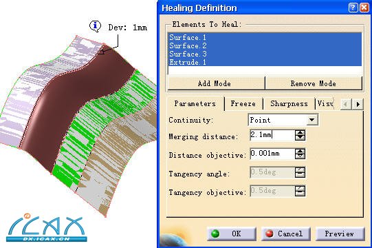 单击“修复(Healing)”  指令,选择图4-47所示中的元素并更改“合并距离 (Merging distance)”为2.1mm,单击预览,变形误差信息显示于萤幕中并指向该元素,如图4-47所示。