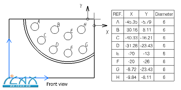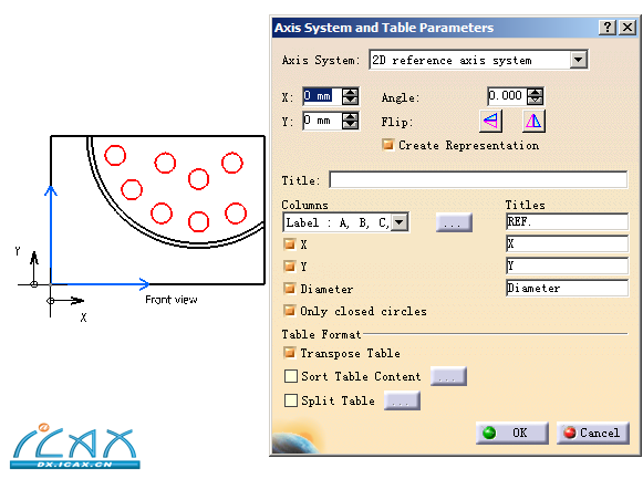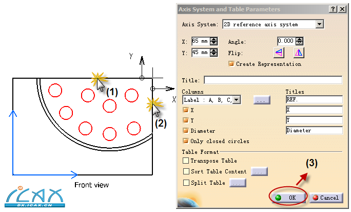 1:打开\Training Part\Drafting\Hole Dimension Table.CATDrawing文件,单击标注(Dimensioning)工具栏里的多孔尺寸表格 (Hole Dimension Table) 指令,用鼠标左键框选所以圆孔元素,弹出孔列表定义对话框。如下图