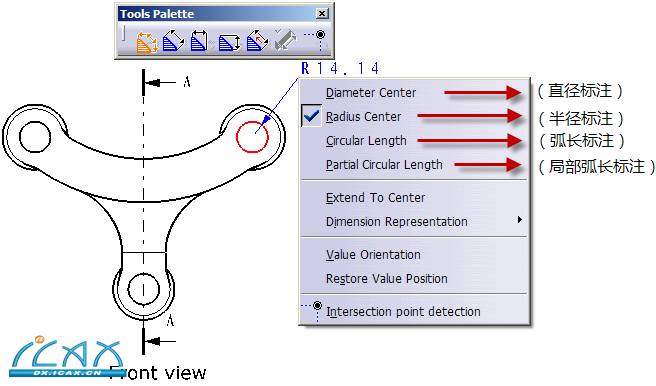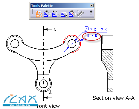 1) 打开\Training Part\Drafting\Type Dimensions.CATDrawing文件,单击标注(Dimensioning)工具栏里的智能标注 (Dimensions)   指令,激活工具面板里的投影尺寸  选项,选择圆孔创建标注。如下图: