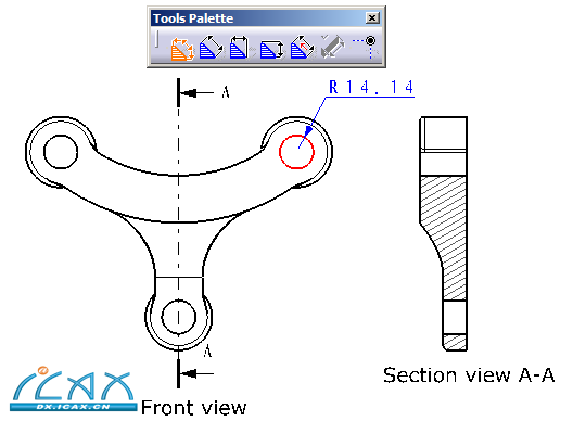 4) 单击标注(Dimensioning)工具栏里的智能标注 (Dimensions)   指令,激活工具面板里的投影尺寸   选项,选择外圆弧,单击鼠标右键选择半径标注,再次单击右键选择注解线延伸到圆心  ,单击鼠标左键完成创建。如下图: