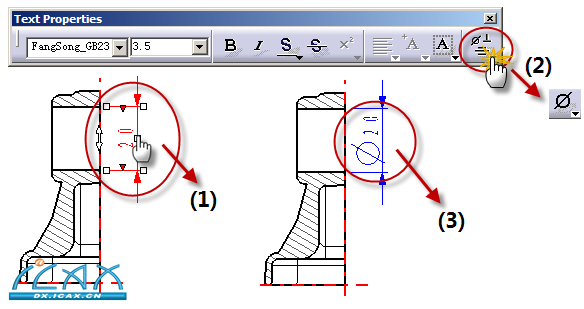 2:增加符号 1)打开\Training Part\Drafting\Add Text.CATDrawing文件,选上要增加注解的尺寸,单击文本属性工具栏(Text Properties)里的插入符号指令(Insert Symbol)  ,选择插入直径符号  。如下图: |