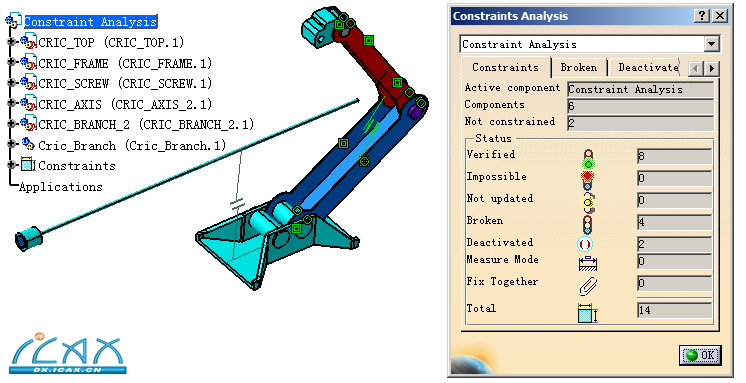 5.35 分析约束 1:查看约束状况 1)打开\Training Part\Assembly Design\Constraint Analysis.CATProduct装配图档,单击下拉菜单Analyze---Constraints…分析约束 指令,弹出约束状况对话框。如下图:2)单击约束页面,可以看见约束状况信息。 A)活动部件 (Active Component):显示活动部件的名称。 B)部件 (Component):显示活动部件中包含的子部件的数量。 C)未约束 (Not constrained):显示活动部件中未约束的子部件的数量。 D)约束状况(Status ):显示当前装配子级别目录下的约束数量。 已验证 (Verified):显示已验证的约束的数量。结构树中的此约束类型图标上显示黄色的无解符号: 。 |