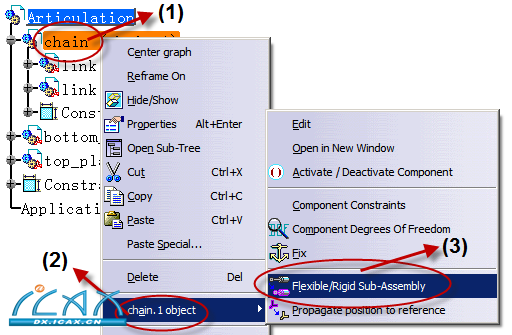 2)选择“chain”[attach]13094[/attach]   产品特征,单击鼠标右键选择chain.1 对象 (chain.1 object)->活动性装配模式切换 (Flexible/Rigid Sub-Assembly) 指令,激活分离模式。如下图: