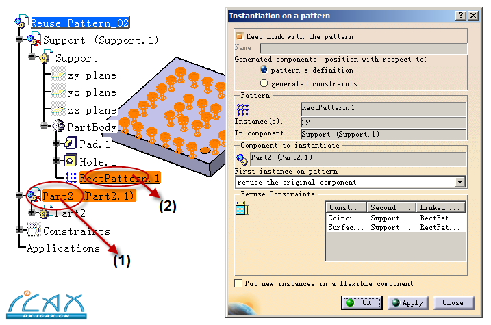 2)单击约束工具栏里的使用阵列   指令,弹出定义对话框,首先选择“Part2 ”作为要阵列的零件,再序选择“Support” 零件下的阵列特征为驱动特征。如下图: