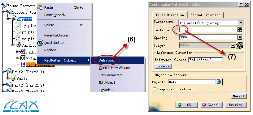 5)在RectRattern.1 特征上方单击鼠标右键,选择RectRattern.1 object --Definition重定义特征,修改X轴的阵列个数为5,单击确认按钮完成修改。如下图: