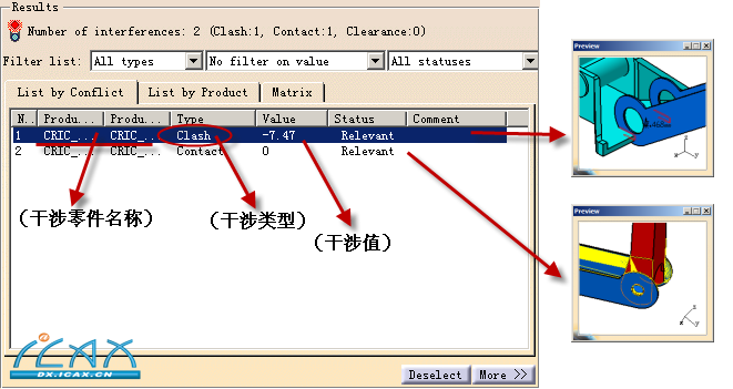 4)在信息栏里面可以看到分析的结果,总共有两个相交结果,一个干涉,一个刚好贴合。如下下图: |