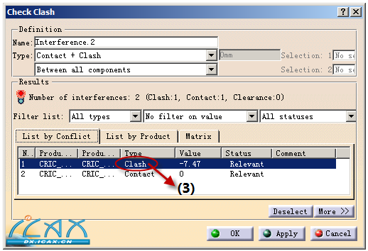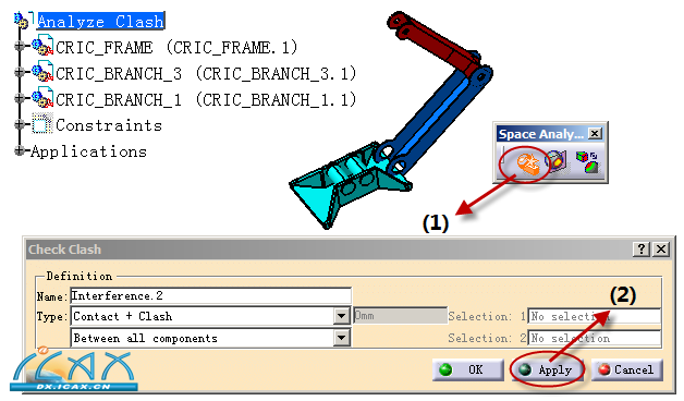 1)打开\Training Part\Assembly Design\ Analyze Clash.CATProduct装配图档,单击空间分析工具栏里的干涉分析  指令,弹出干涉分析对话框,单击应用按钮。如下图: